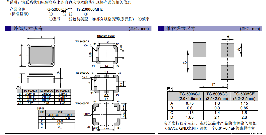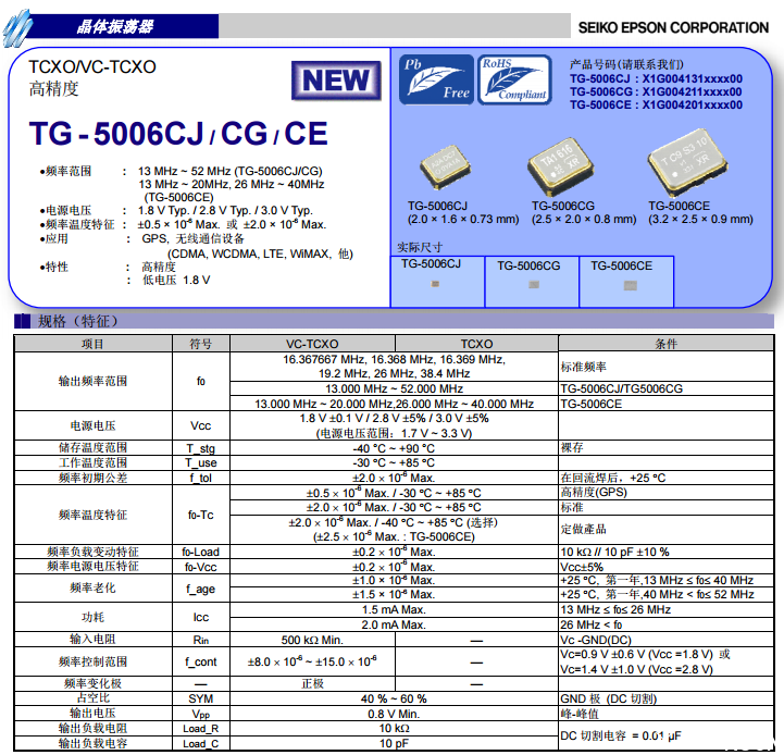 今天給大家介紹TG-5006系列:TG-5006CJ,TG-5006CG,TG-5006CE。精密的時間是現(xiàn)代通信、導(dǎo)航定位以及計算機自動控制的關(guān)鍵和核心,目前主流應(yīng)用都是采用TCXO溫補晶振來提供。高精度晶振廠商愛普生晶振新推出超小型溫補晶振TG-5006系列:TG-5006CJ,TG-5006CG,TG-5006CE。其中每個型號都對應(yīng)3種版本:VC-TCXO、TCXO和TCXO(具待機功能),可滿足多樣化的用戶需求。低功耗、頻率穩(wěn)定、小型化的優(yōu)點讓其適合應(yīng)用于GPS設(shè)計、射頻和無線通信設(shè)備(CDMA、WCDMA、LTE、WiMAX)等有高精度和高可靠性要求的設(shè)備。TG-5006根據(jù)型號的不同具有不同的輸出頻率范圍,其中TG-5006CJ,TG-5006CG的輸出頻率范圍為13~52MHz,TG-5006CE的輸出頻率范圍為13~20MHz,26~40MHz,多種頻率輸出為用戶的設(shè)計提供了更加靈活的選擇,那么TG-5006CJ,TG-5006CG,TG-5006CE三種型號該如何識別,三個型號規(guī)格參數(shù)又有什么區(qū)別呢?南山電子幫你具體來分析下,首先我們來看規(guī)格書: