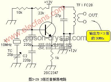 (此為利用無(wú)調(diào)整電路的高諧波成分,在輸出的諧振電路取出3倍頻的30MHz信號(hào)。)