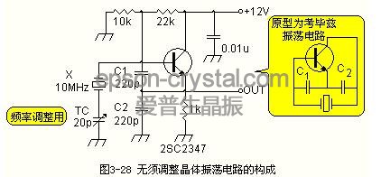 圖28所示的為無(wú)調(diào)整晶體振蕩電路。其原型為考畢茲振蕩電路。